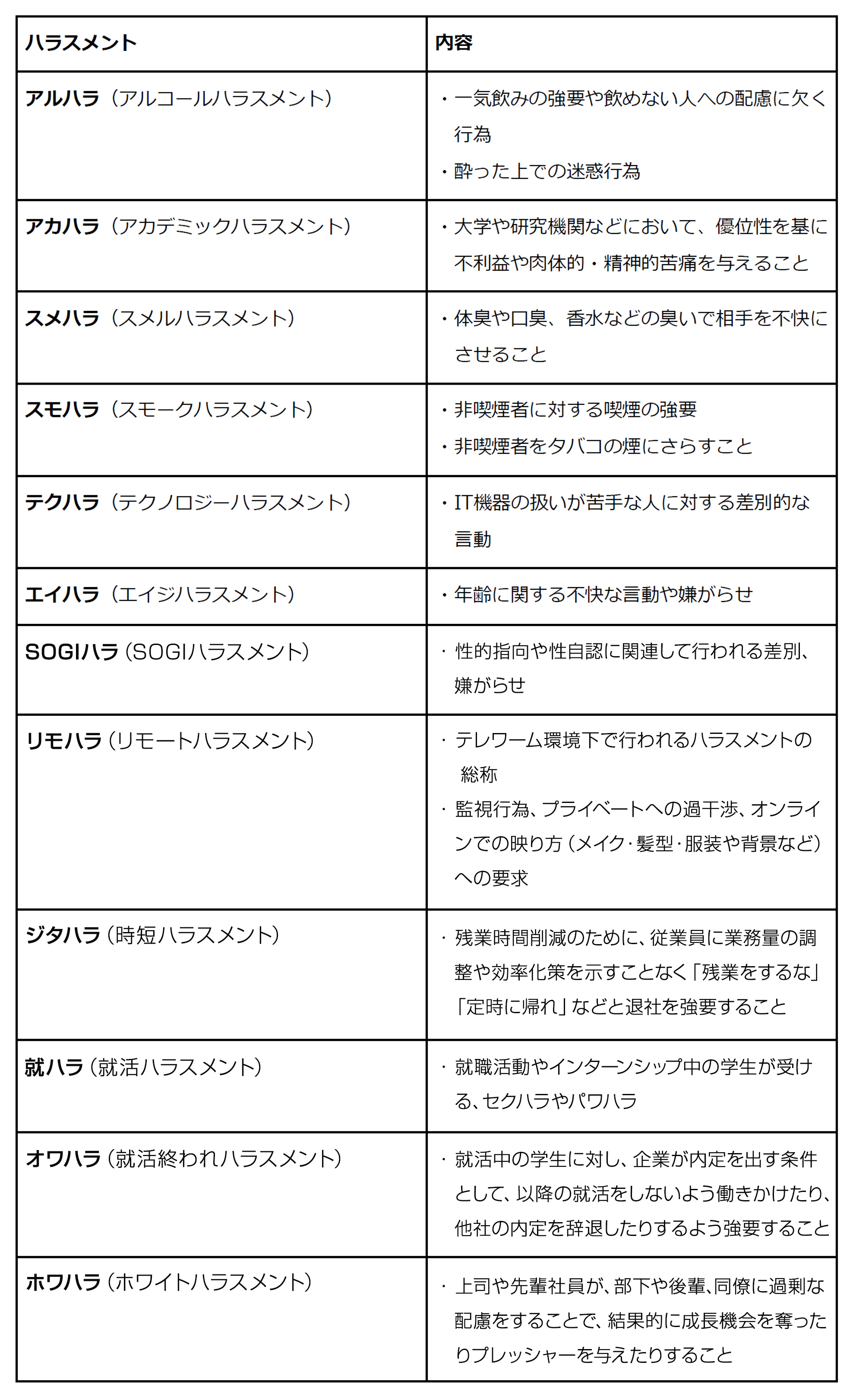 職場で起こり得るハラスメントは、以下のようにさまざまな種類があります。
